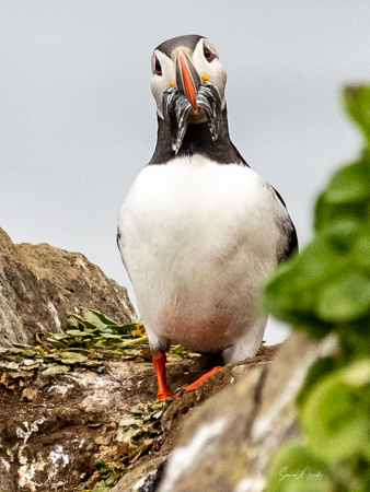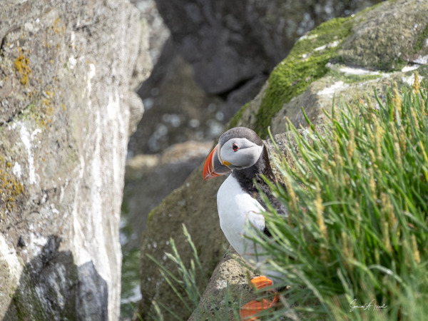 Footballs. They look like black and white footballs. While penguins, to whom they are often compared, are sleek, puffins are stocky with large beaks that look like they should fall over. Like penguins, their bodies are black and white, black on top and white on the bottom which protects them from predators both from the sea and from the sky. During the breeding season, their beaks turn a bright orange. Interestingly, the rest of the time, they shed their bills which leaves a smaller and duller beak. Luckily we were here during breeding season.