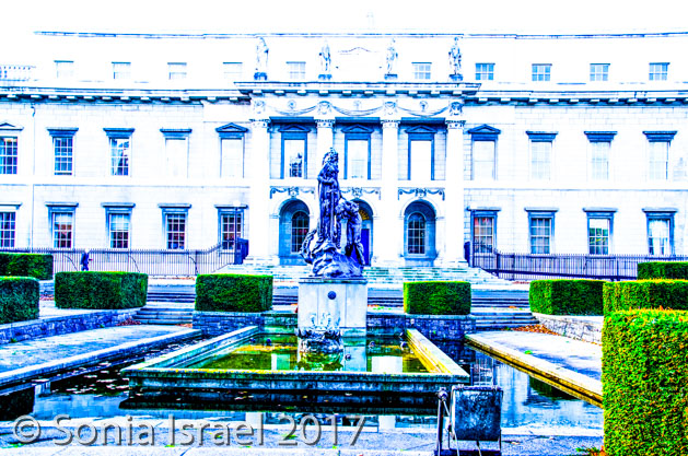 Merrion Square was designed in 1762 and is one of the most intact Georgian Squares in Dublin. It is surrounded on three sides by Georgian redbrick houses with museums and government buildings on the last side. But it is the center of the square which is most beautiful as it is a public park, filled with flowers and statues including one of Oscar Wilde sprawled across a large rock. This sculpture is really in three parts. There is the sculpture of the author himself on a large rock, a pillar with a bronze of