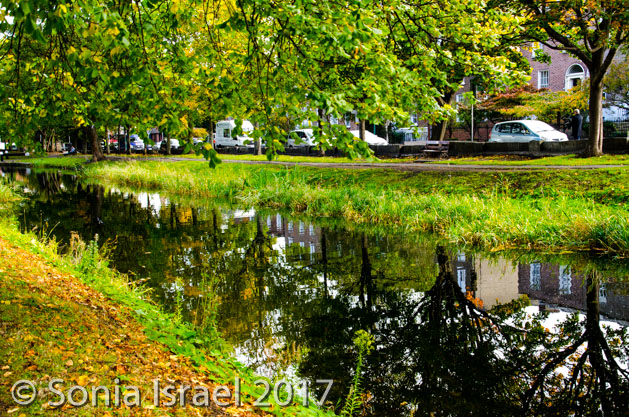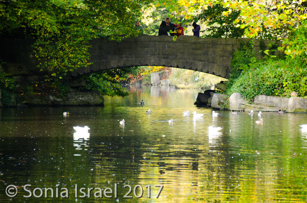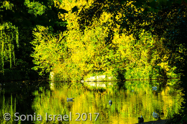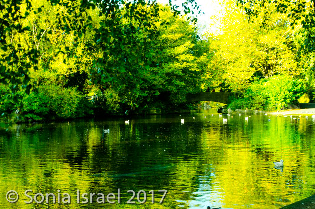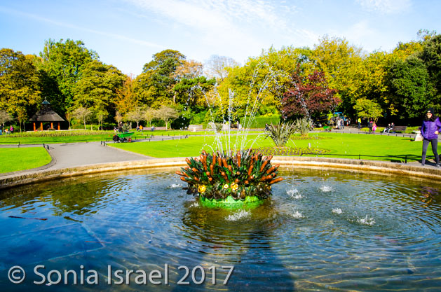 From here we walked to St. Stephen’s Green. St. Stephen’s Green is much larger than Merrion with even more playgrounds, flowers, fountains and sculptures, including another one called Famine. There were ponds with ducks and swans, and beautiful trees in yellow and orange and red, reflecting in the water. Stone bridges arched over the lakes. Birds flew everywhere.
