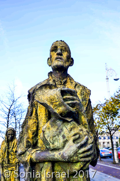 be pointed in the right direction, and as I thought from the map, we were only about one block away. There are actually many famine statues around the city, in fact, around the country, but this is one of the more famous ones. This one is striking. It is of six very graphic and sad adults, one carrying a child, and one dog, representing the starving and dying population of Ireland as they tried to reach the Dublin port on foot to escape from Ireland and certain death due to starvation during the Potato Famine of 1845-1848.