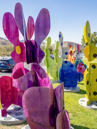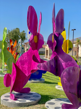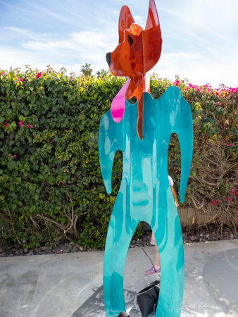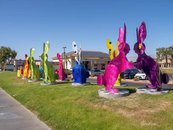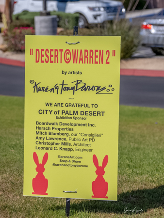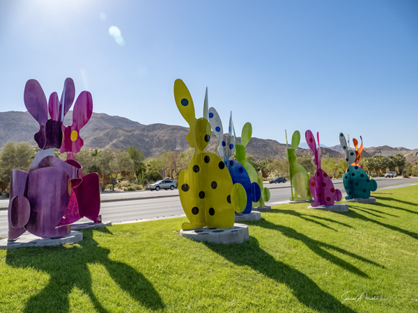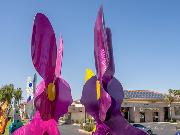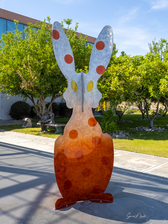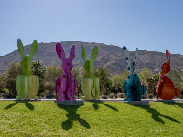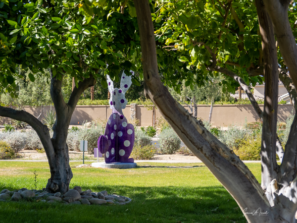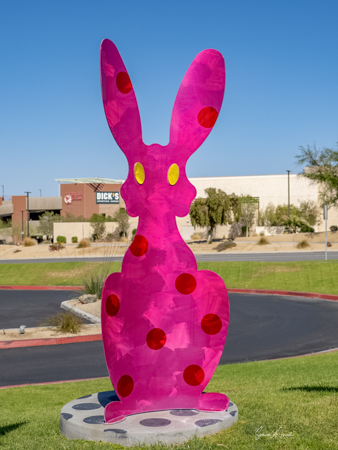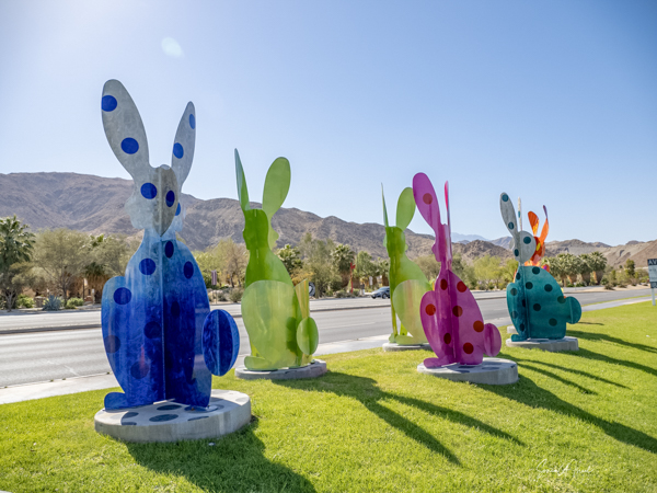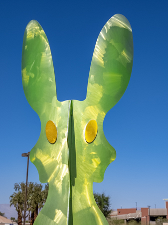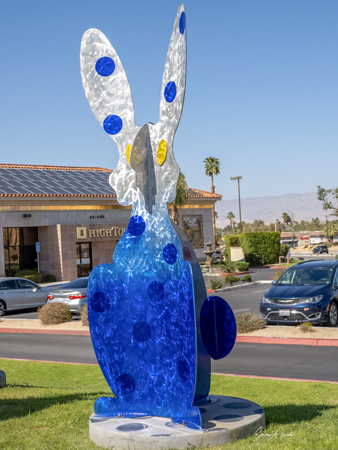 The rabbits stand 7 to 8 feet high in vibrant colors, some solid, some with polka dots. They are all over the Coachella Valley, but we went to the one called, Desert Warren 2 in Palm Desert. [Note – if you click on the photos, not only will they get bigger, but you can see the names of the sculptures.]