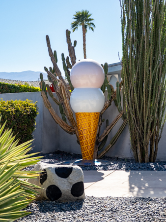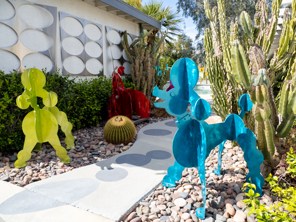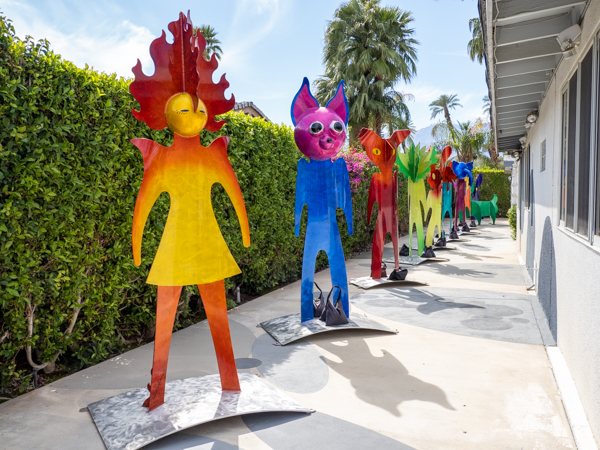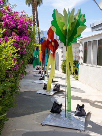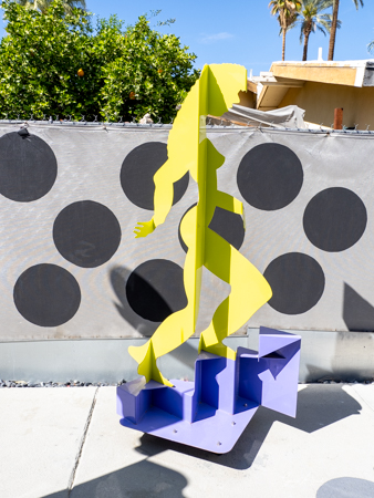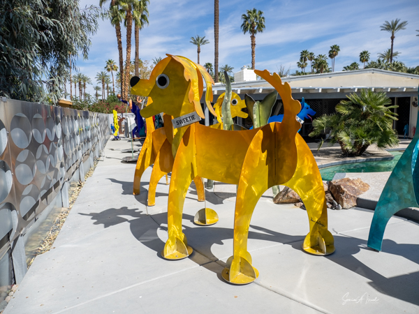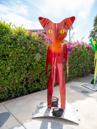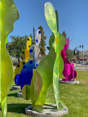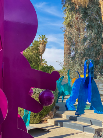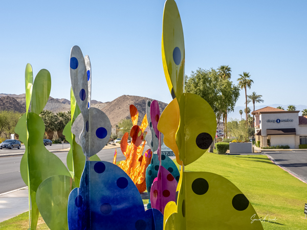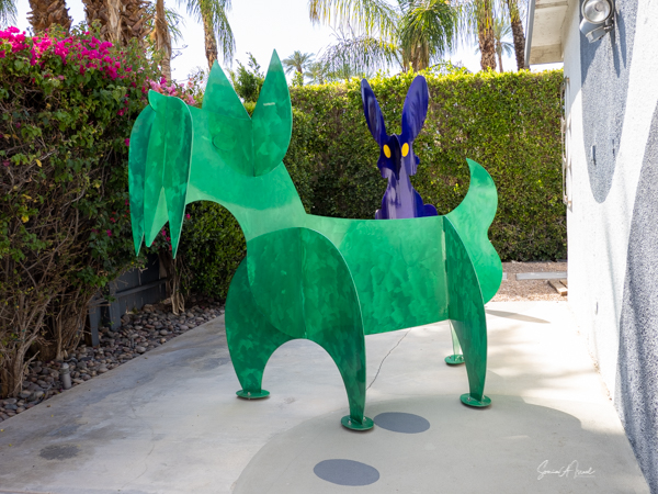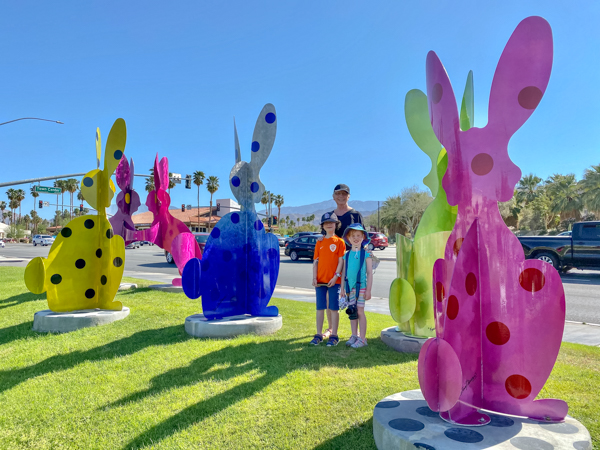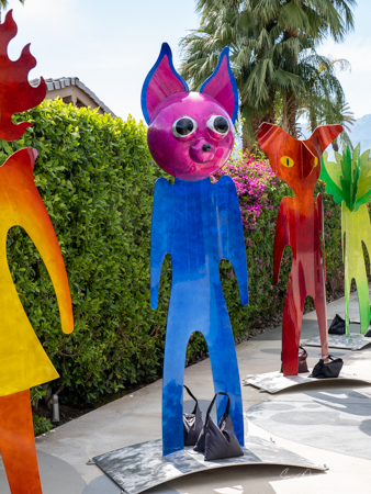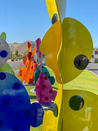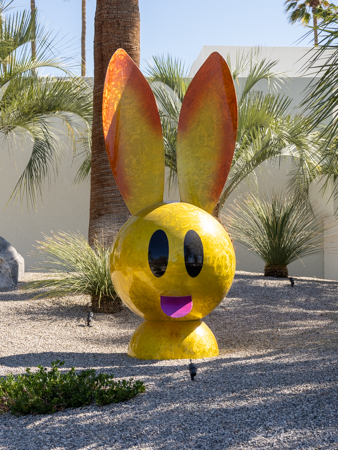 The rabbits stand 7 to 8 feet high in vibrant colors, some solid, some with polka dots. They are all over the Coachella Valley, but we went to the one called, Desert Warren 2 in Palm Desert. [Note – if you click on the photos, not only will they get bigger, but you can see the names of the sculptures.]