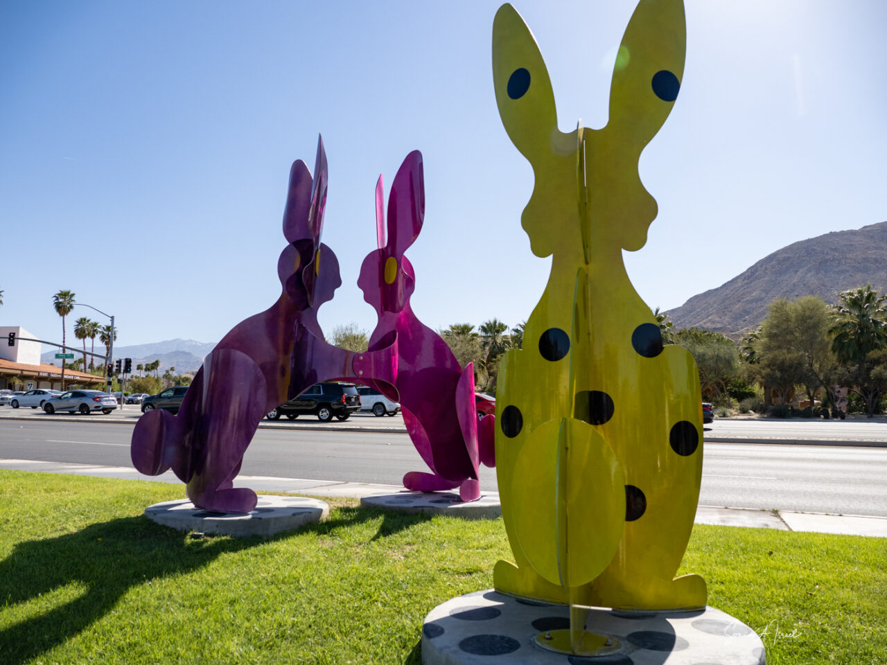The rabbits stand 7 to 8 feet high in vibrant colors, some solid, some with polka dots. They are all over the Coachella Valley, but we went to the one called, Desert Warren 2 in Palm Desert. [Note – if you click on the photos, not only will they get bigger, but you can see the names of the sculptures.]
