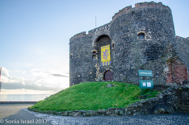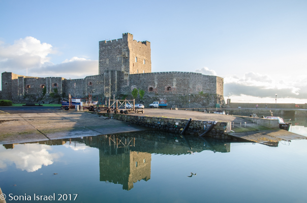 Our first stop was not on our original itinerary.  It was the Carrickfergus Castle, a Norman castle siituated in the town of Carrickfergus on the northern shore of Belfast Lough (pronounced loch meaning lake). Besieged in turn by the Scotish, Irish, English and French, the castle played an important military role until 1928 and remains one of the best preserved medieval structures in Northern Ireland. It was strategically useful because 3/4 of the castle is surrounded by water. But none of this was the reason we stopped. We stopped here because the mother of one of the women on the trip grew up right across the street, and since it wasn’t really out of our way, Colm agreed to stop there.  The water around the castle was like a mirror with the boats reflected in it. That was actually the most beautiful part of the stop.