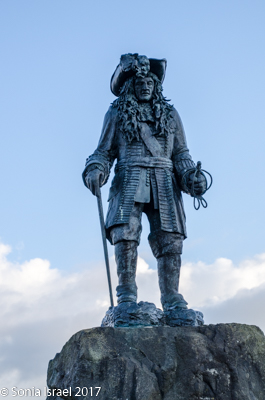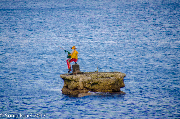 Then it was hit the road again. Back along the coast. More hills. More cows and sheep. This time we passed a rock in the water with a statue of a fisherman on it.