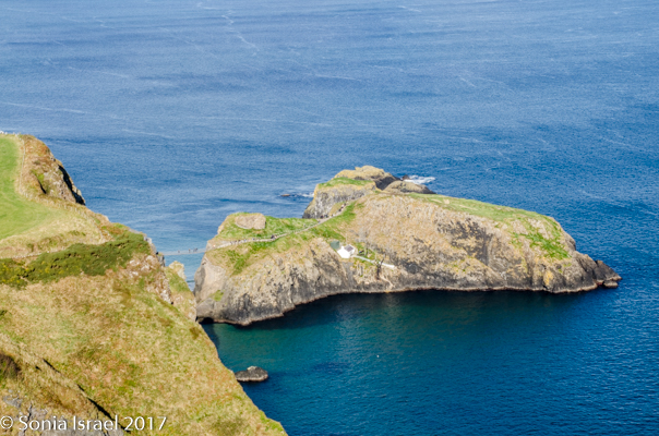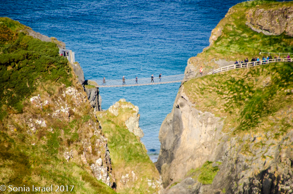 We headed northwest continuing along the coast of Antrim to our next stop at Portaneevey, near Ballintoy. The attraction here is the Carrick-a-Rede (rock in the road) Rope Bridge to Carrick Island and the view across the water to Scotland.  The little island, which is really a big rock, is right in the path of the salmon migration, with the salmon swimming upstream of the nearby freshwater river. The fisherman built the rope bridge in order to easily access the island to fish and check their nets. As often happens, today there are almost not more salmon due to overfishing, but the bridge is still there and tourists flock to cross this precarious rope suspension bridge which spans 65 feet over a 98 foot deep chasm. We didn’t cross the bridge but did enjoy the beautiful views. There was a large grassy area near the carpart and there was a father and his small son playing with a toy dump truck. And all around were couples and families enjoying the beautiful sunny day.