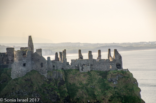 We drove off and made a quick stop, not even getting off the bus, to see the ruins of Dunluce Castle, a medieval castle on the edge of a basalt outcropping. The castle is surrounded by extremely steep drops on either side, which may have been an important factor to the early Christians and Vikings who were drawn to this place where an early Irish fort once stood. But for us the sun was starting to set and all we could see was the outline of the ruins, which was quite eerie but beautiful.