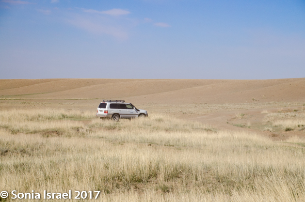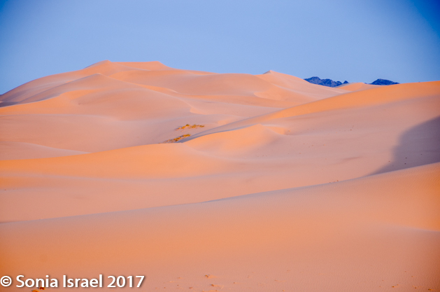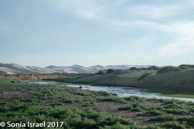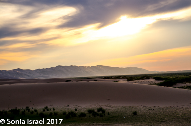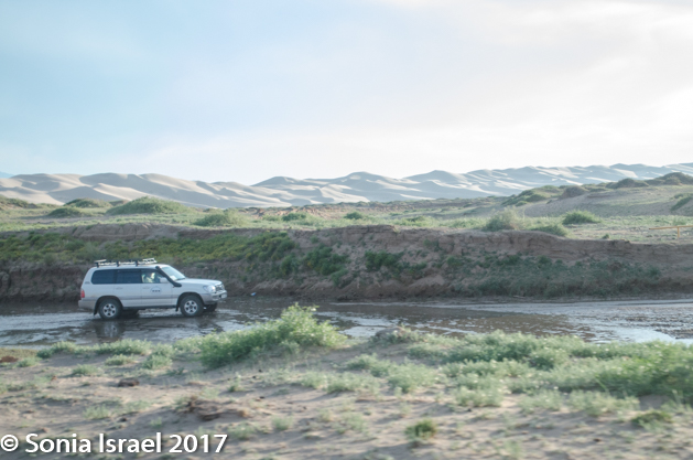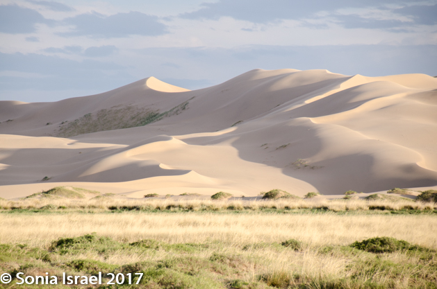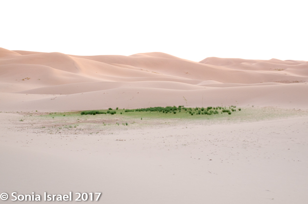 This morning, after breakfast, we grabbed a small bag for one night at the Khongoryn Els sand dunes. It was about a three hour drive, so our caravan set off again, across the desert. At one point the caravan stopped and we stepped out to admire the shapes made by the mountains and the dirt and the patches of green. Whenever you see a patch of green in the desert, you know that is where there is water, the source of life.