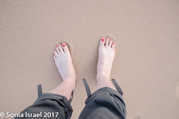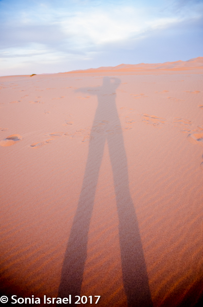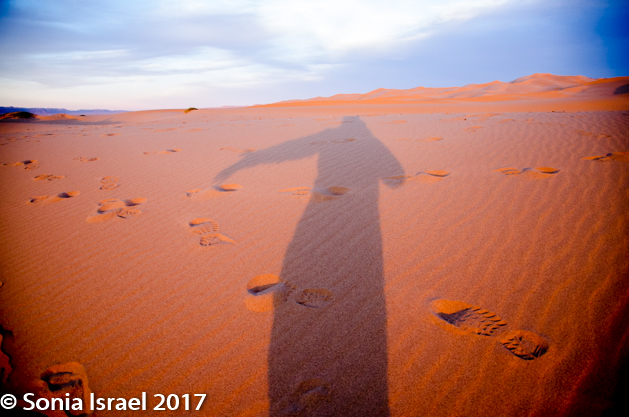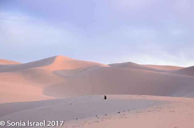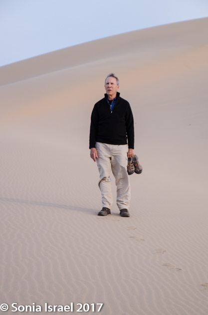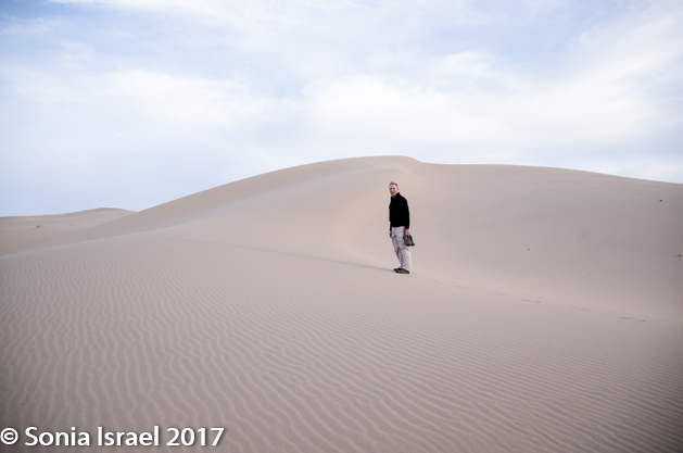 That evening we came back to photograph the sunset on the dunes. Azaa and Andy and I took off our shoes and started climbing. The sand was like silk between our toes. And it was hard which made it easier to climb. Until we got close to the top at which point the sand became soft and slippery and stopped me in my tracks. Azaa managed to climb almost to the top. And the top is high. The sand dunes are up to 984 feet high, 7.5 miles wide and 62 miles long.