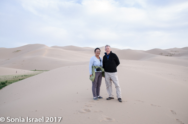 But before we could plant our feet on the sand dunes, we got to ride Bactrian camels. At the foot of the sand dunes lives a nomad family that owns hundreds of camels and they rent them out to tourists like us. Now, Andy and I rode camels in Egypt, around the pyramids. And we rode camels up and down the sand dunes in Morocco. But here, we rode the camels for about 15 minutes away from the nomad’s ger, and 15 minutes back. It felt like a Disneyland ride. We broke into two groups, and while one rode the other visited the family. And then we switched. And while we did all this, our drivers used the time to take naps.