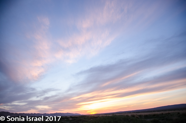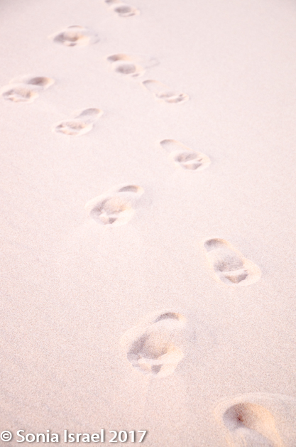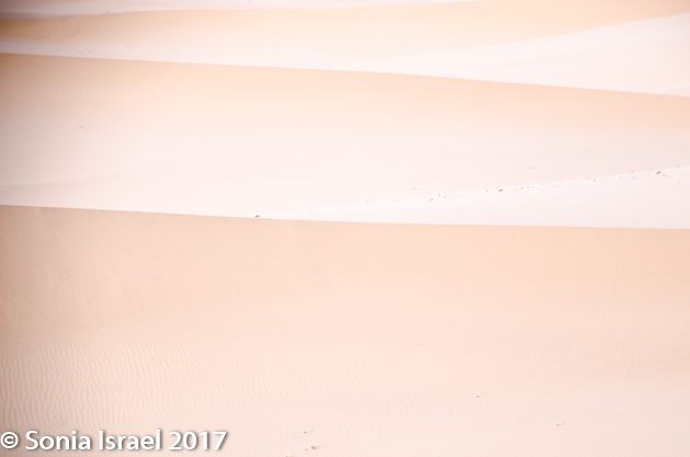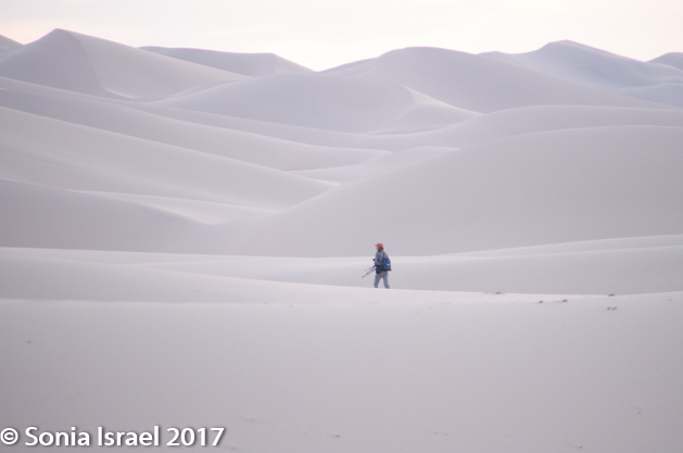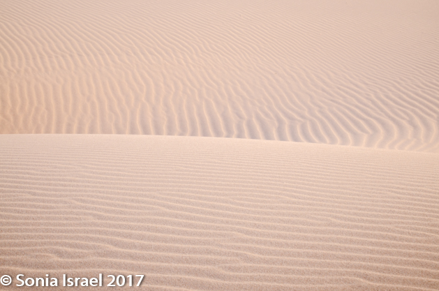 And the shapes and the colors – oh my. The dunes have curves which end in a sharp edge, making them look like ocean waves. Or in this case, a ying yang. And as the sun set, the colors changed from white to pink to orange. It was breathtakingly beautiful. We stood there a long time watching the colors. Watching the shapes change. Playing with our shadows. Until it was getting hard to see and we had to head back.