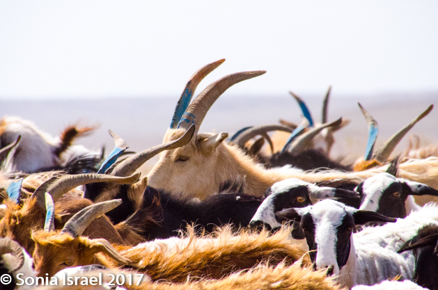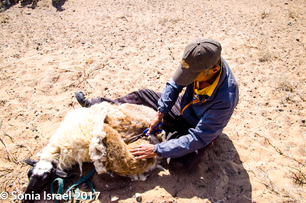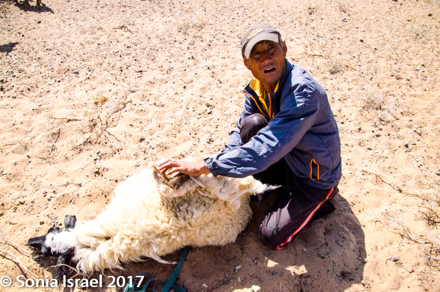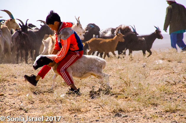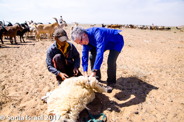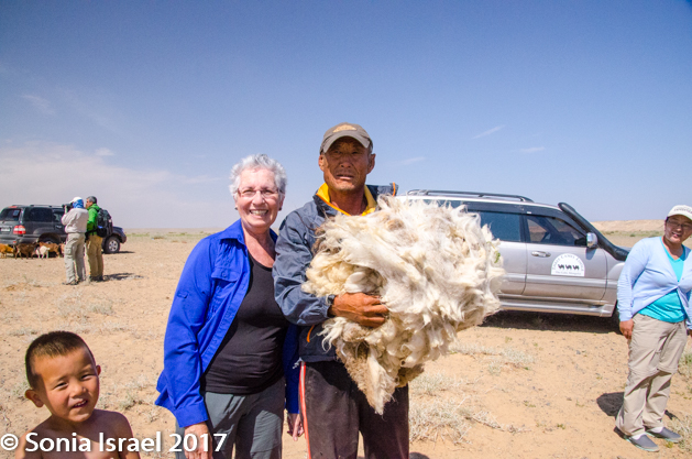 After breakfast we headed to the Tugregiin Shiree to walk where dinosaurs once walked. We were in no rush. Our caravan made its way through the desert, again forging new paths and kicking up dust.  As we crested a hill, we suddenly saw a herd of sheep and goats being sheered. Of course our caravan stopped and we all got out, cameras in hand. The family’s ger was across the road, with two motorcycles along the side. But the family was all participating in the shearing.