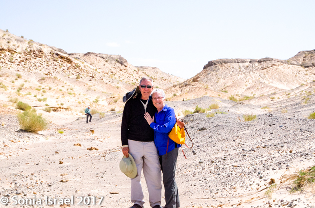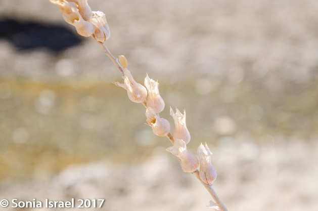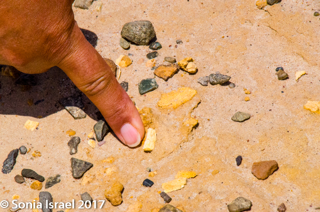 dinosaur bones. The terrain was almost eerie. Green shrubs were popping out of rocks. The rocks were all different colors, including bright orange. And we walked carefully, our eyes focused on the ground looking for dinosaur bones. So, how to you tell a dinosaur bone from a stone? The dinosaur bone sticks to your tongue.