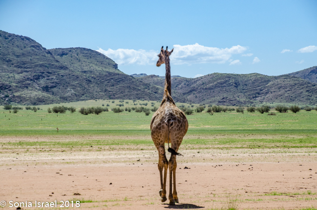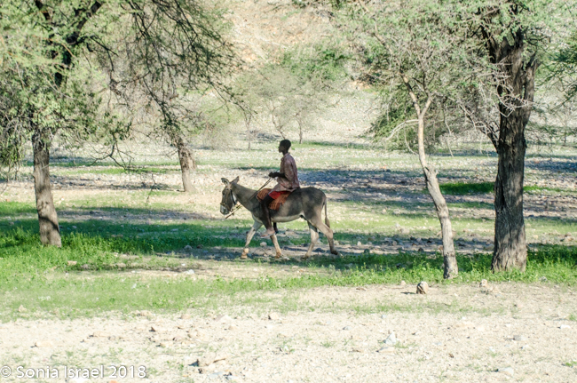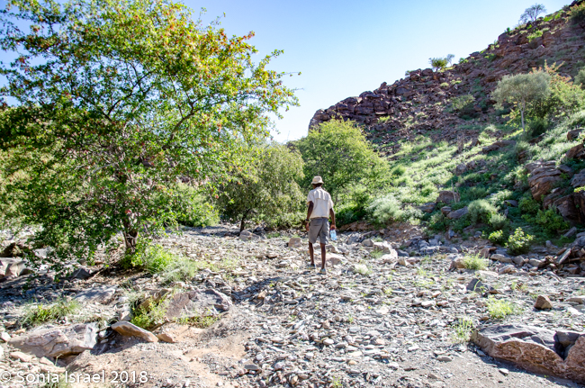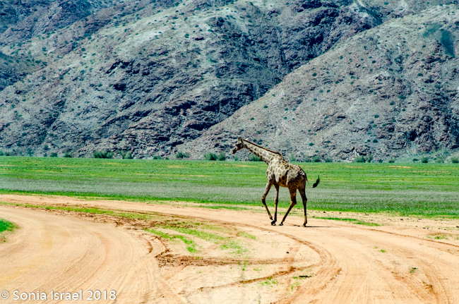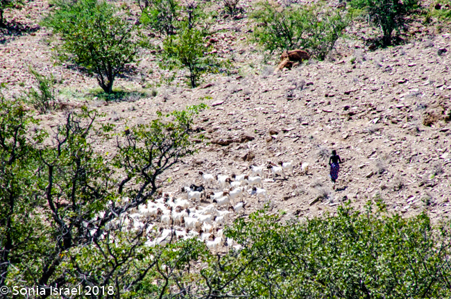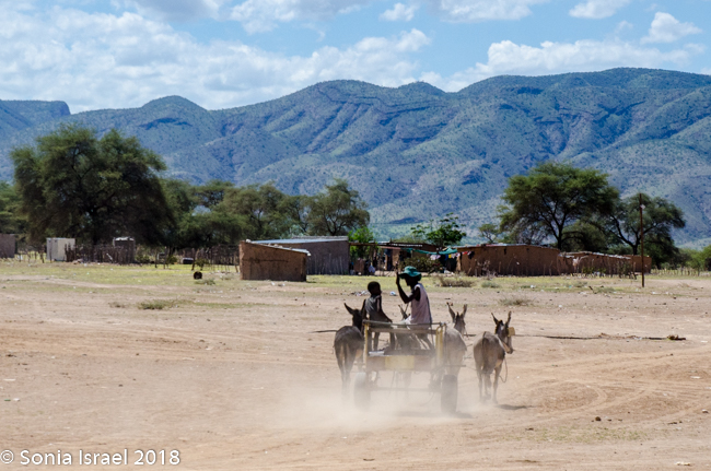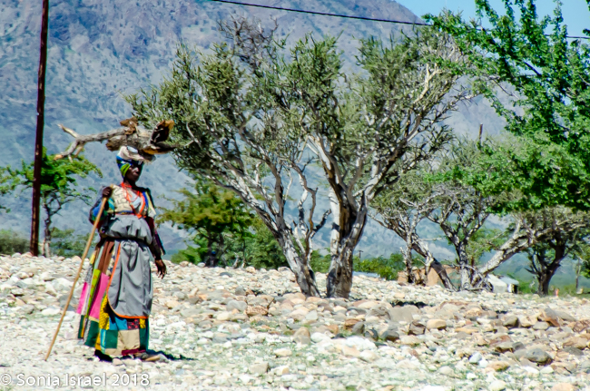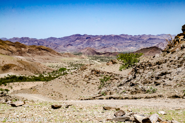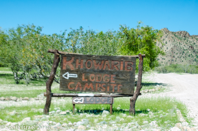 Our destination was the Khowarib Lodge just outside of Sesfontein, a small town, or more like a settlement in this area, with a population of about 7000. The name comes from the six “fountains”, or springs, in this area.  We drove by the local post office, liquor store and general store which were full of people. It felt strange to see groups of people and small shops after all that time in near isolation. Almost like a culture shock, or back to civilization. Sesfontein is a dusty spot, more like an outpost than a town. But for the locals it is their place to hang out, to see neighbors and to spend their money. We would be back here tomorrow when we would get to observe and meet the locals up close and personal (Namibia Chapter 7).