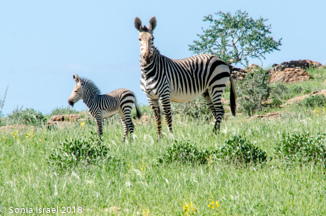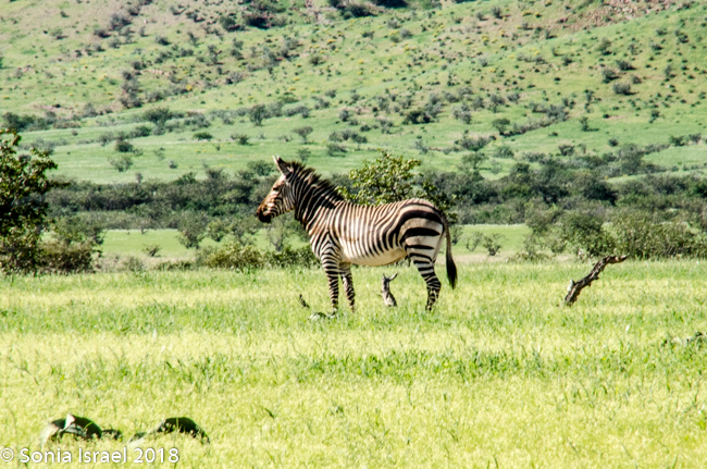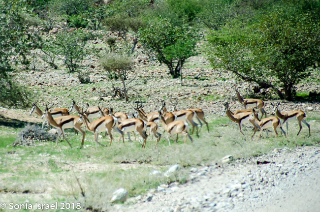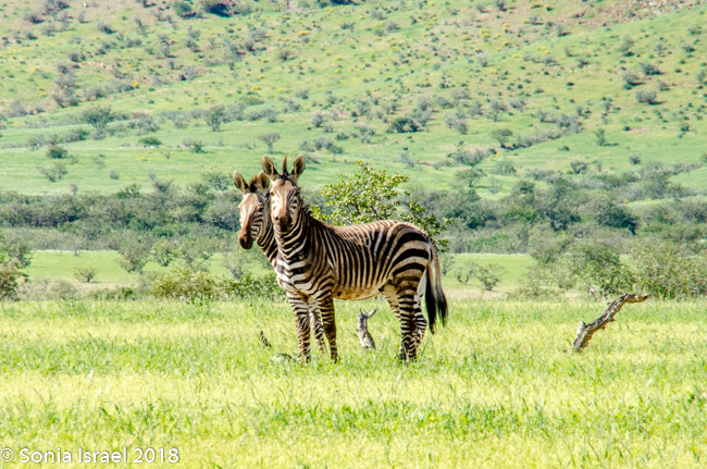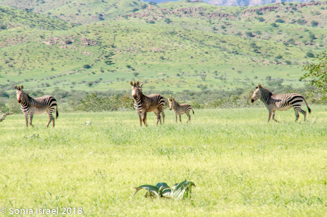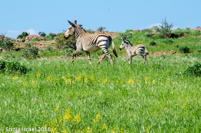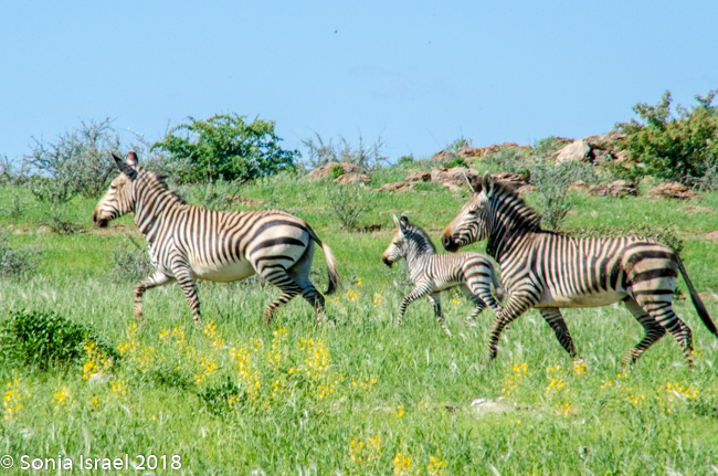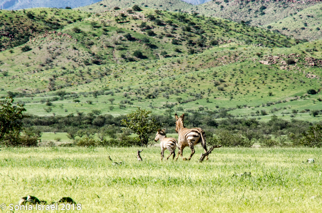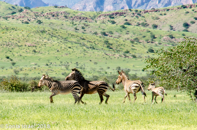 And then we suddenly saw a zeal (or dazzle) of zebras (that is what you call a group of zebras). With babies. They were running as fast as they could.  Not from us, but just because it was fun. These were Hartmann Mountain Zebras, with white bellies. Hartmann zebras live in small groups of 7-12, are agile climbers and are able to live in arid conditions and steep mountainous country – exactly the kind of terrain we were in.