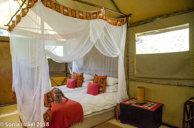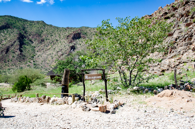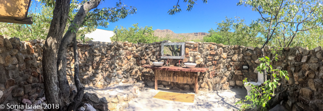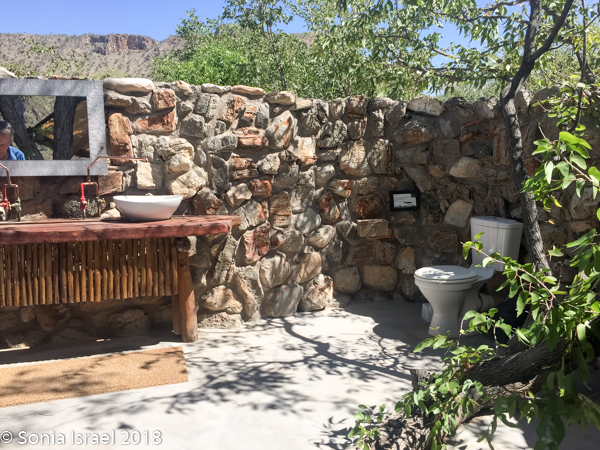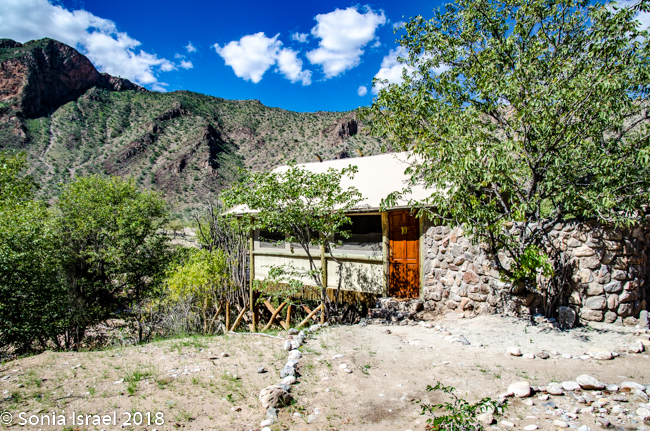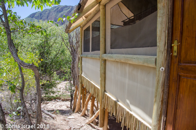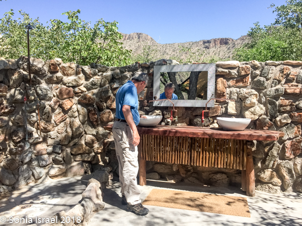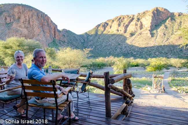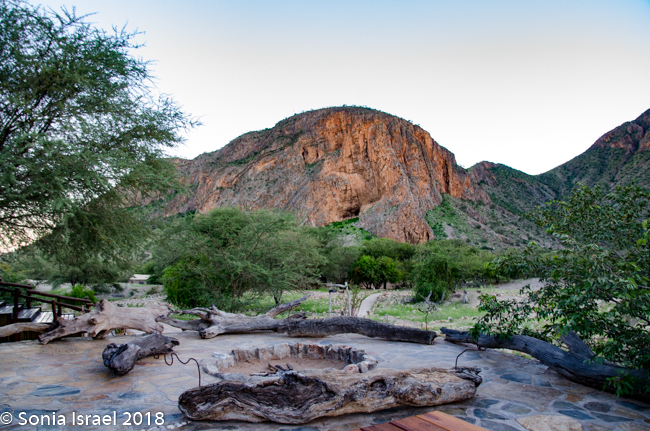 We finally arrived at the Khowarib Lodge on the banks of the Hoanib river in the magnificent Khowarib Gorge.  Or we thought we had arrived. We found ourselves at a campground, which the lodge also owned. So we backtracked and tried again, this time finding the right road that ended in the gravel parking lot of the lodge. We walked up the path to the main house and were greeted with lunch, which we had already eaten….oh well. The main reception area and dining area is built as a lapa, an immense thatched structure constructed from local materials in a traditional style. We sat there in the evenings as well, having drinks and looking out over the kopje, (a South African word for a hill in a generally flat area), except to me it looked more like a mountain than a hill.