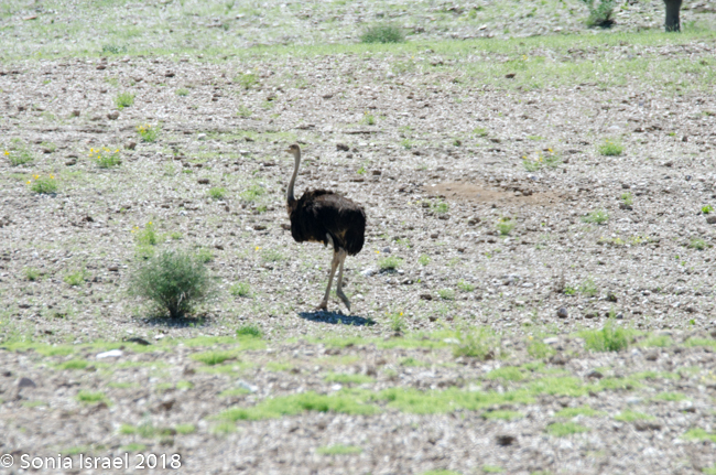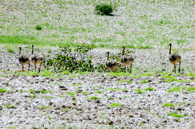 We passed a whole family of ostriches. There was a male ostrich (father?), a female ostrich (mother?0 and 5 babies, toddling along next to them.  I had never seen baby ostriches before. So cute! But don’t get too close…