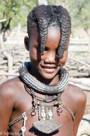 Hair also gives away a woman’s status. The young girls we saw had two braids (ozondato). Once a girl passes puberty, the two braids cover her face so the men know she is not ready to be married. When she is ready to marry, the braids are removed from her face so potential suitors can see her. Once she is married for at least one year, or when she has a child, she begins to wear a headdress, the erembe, made of cow or goat leather.
