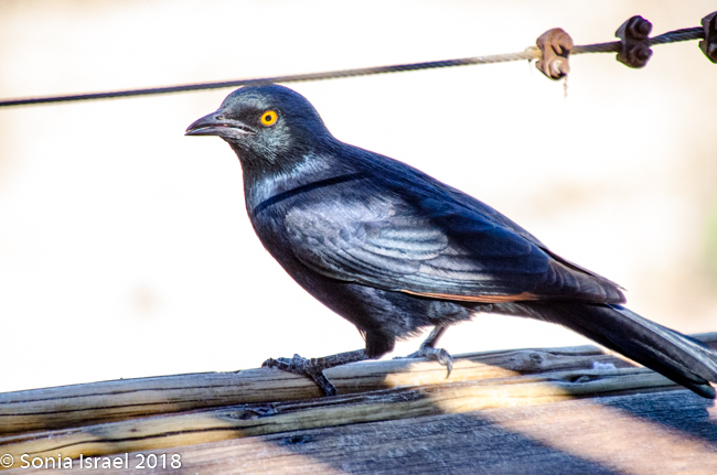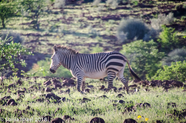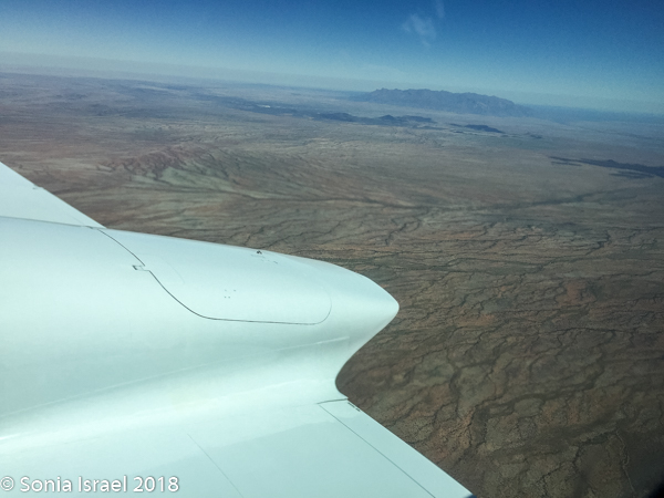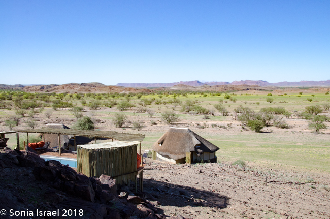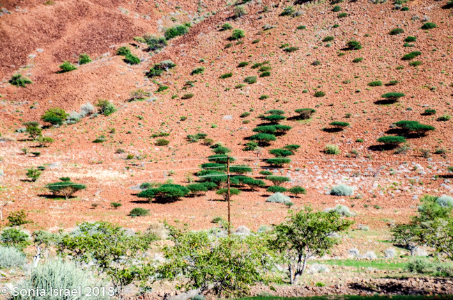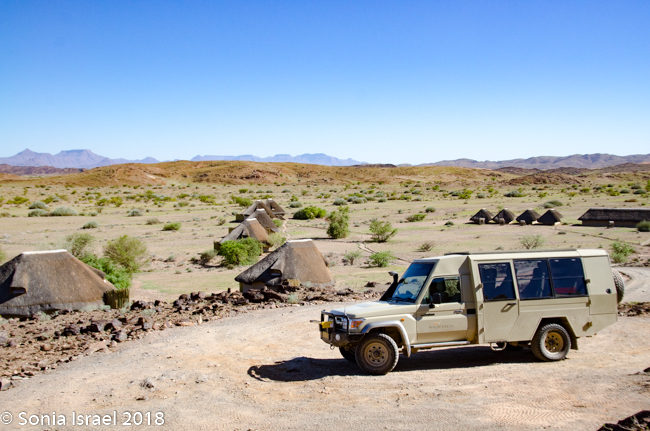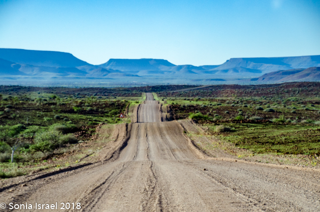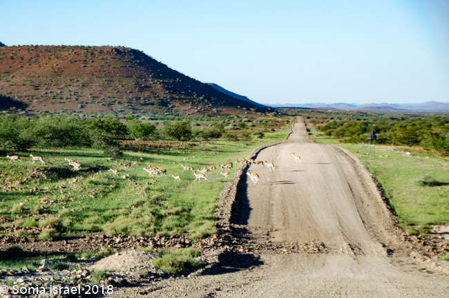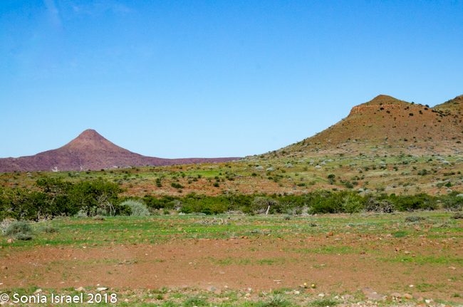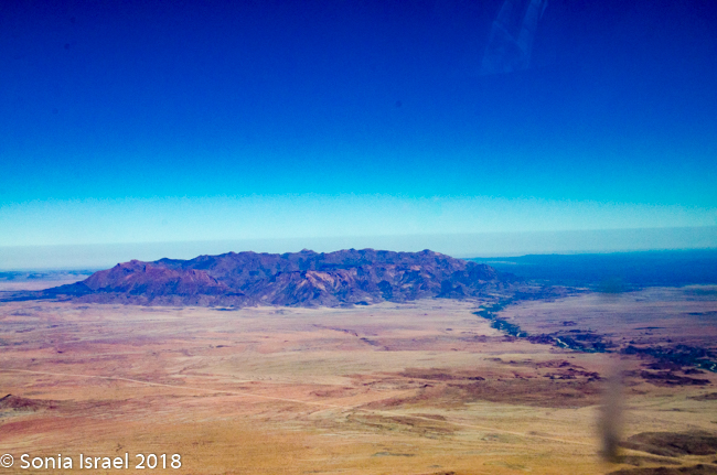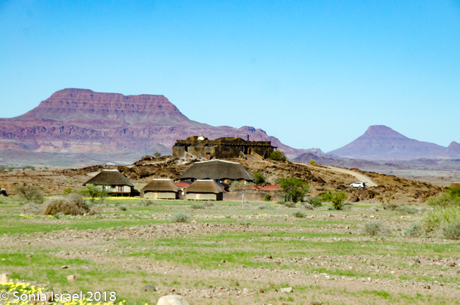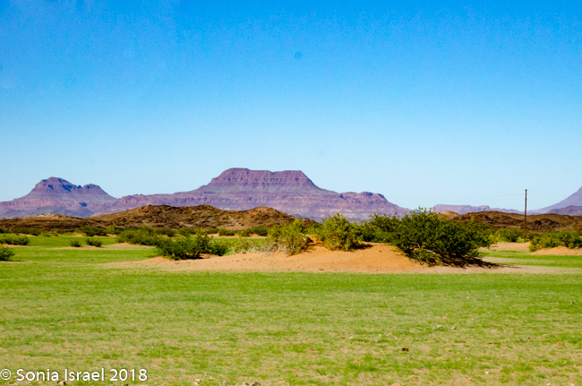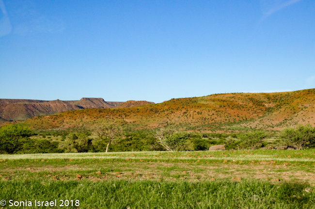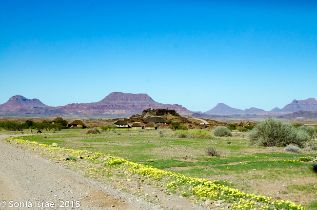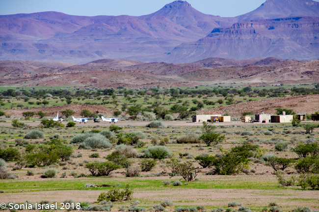 Charles had us leave right after breakfast. It would be a 4-5 hour drive to get to the airstrip where a bush plane would take us to Windhoek, where we would connect to a flight to Johannesburg. The sun was low on the horizon as we headed east and then south on C43. The sky was blue. We passed Herero villages and then Damara villages. The mountains were a purple-red. The fields were a lush green with little yellow flowers.