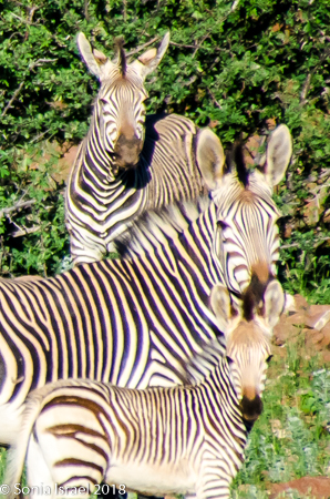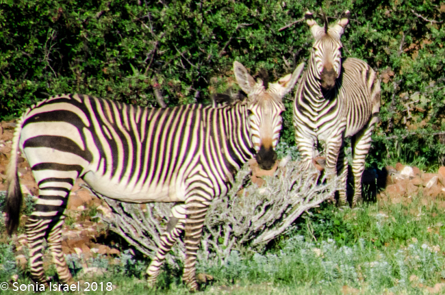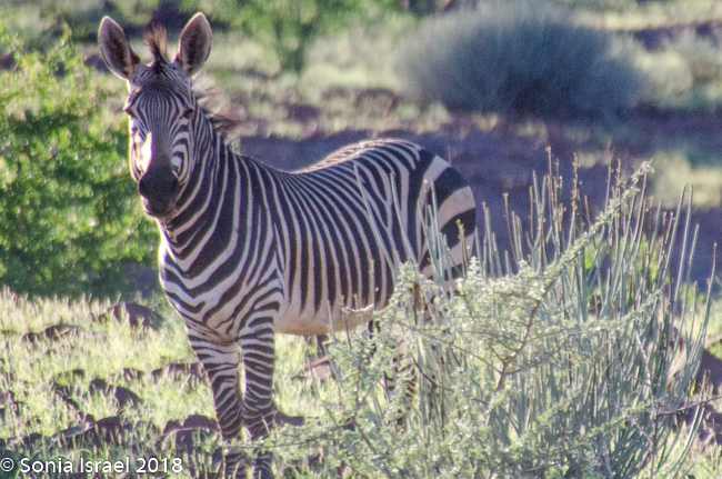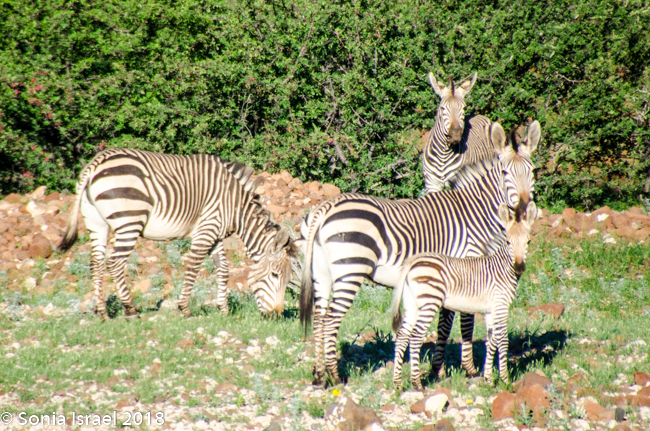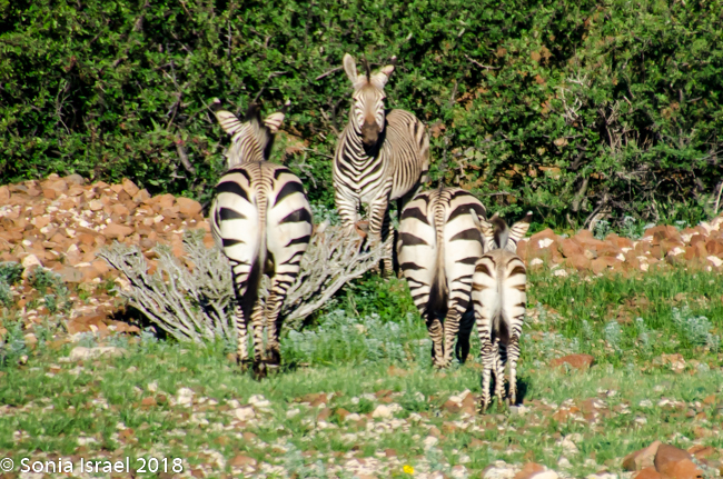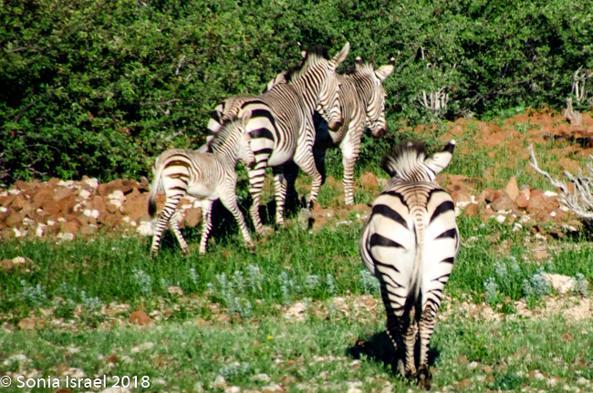 And the animals were all out as if to wish us a “Bon Voyage, see you again soon.” A large dazzle of Hartmann Zebras with their white bellies and their babies running along the side of the road. Spring buck running across the road. Giraffes nibbling on the tress. A Kori bustard running to take off and then soaring into the sky.