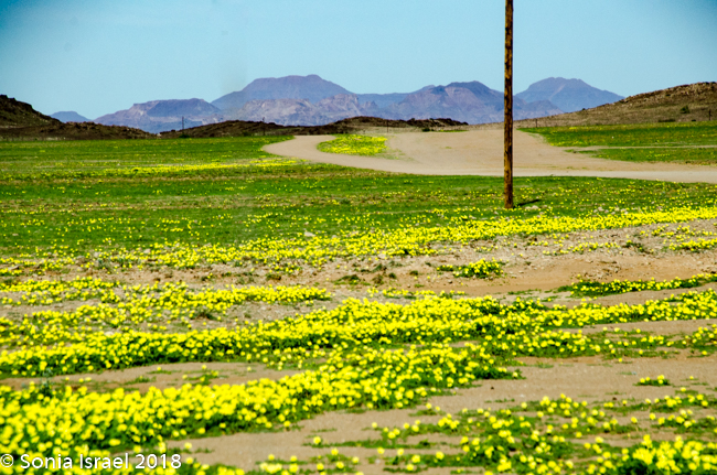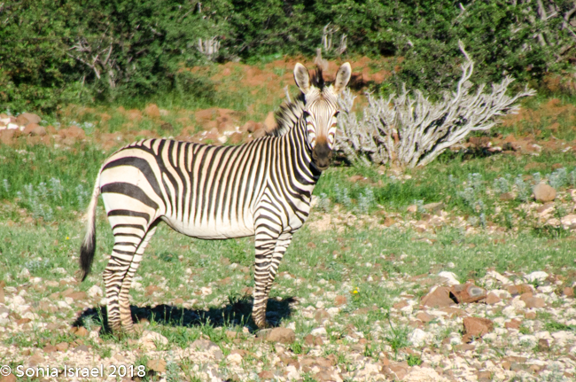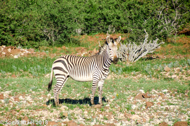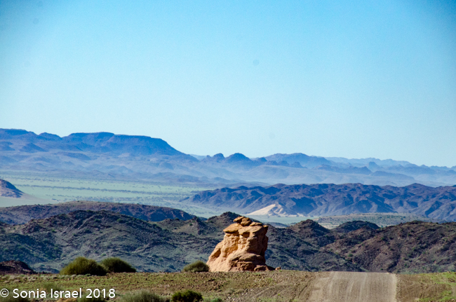 The landscape changed again. We began seeing sandstone, especially one very large piece of sandstone, the border of Damaraland. And while still here, there were fewer pastures and fields. The grass was shorter but there were still lots of yellow flowers, the devils thorn. Now the terrain began looking more like desert again.